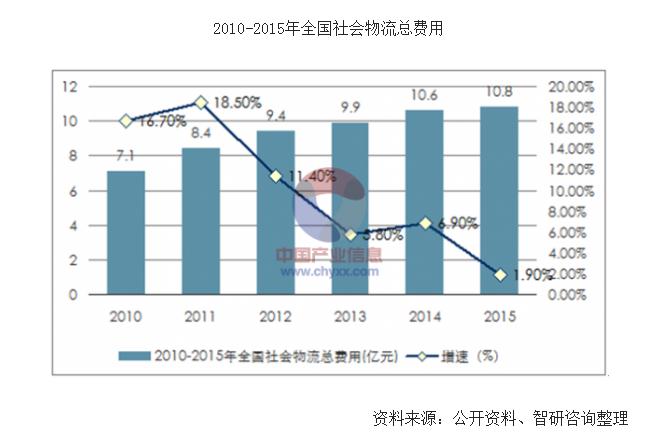 近年來,中國經濟保持平穩較快增長,為現代物流及供應鏈管理外包服務行業的快速發展提供了良好的宏觀環境。據國家統計局數據顯示,2015年,我國物流總費用為10.8萬億,較上年增長了1.9%。市場規模巨大,前景廣闊。