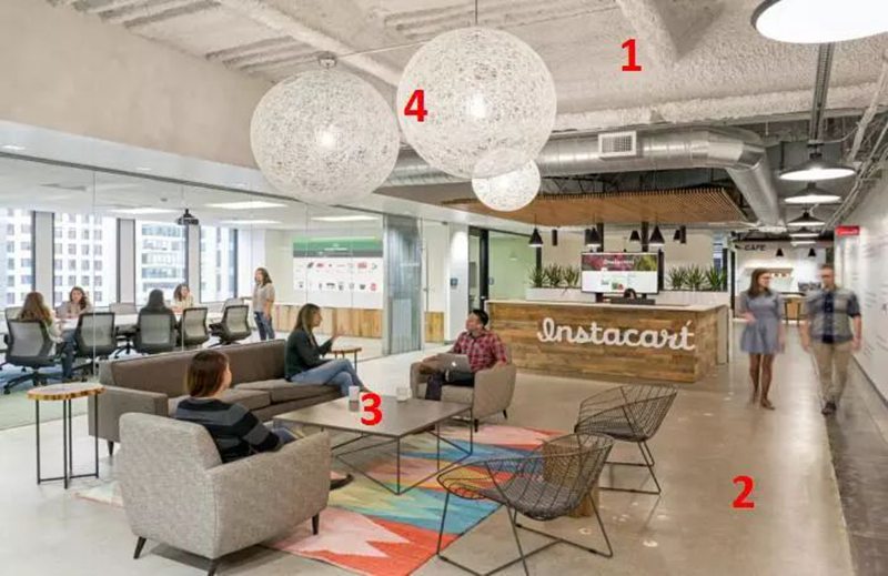 水吧區是員工午休以及接待使用區域很高的一塊區域,很直接的反應出一個公司的氛圍,陽光休閑舒適是這里的主題,布置方面以北歐休閑的形式,搭配一些輕工業風的家具,天花做了燈膜,地面采用仿木紋地磚,家具現代簡約。