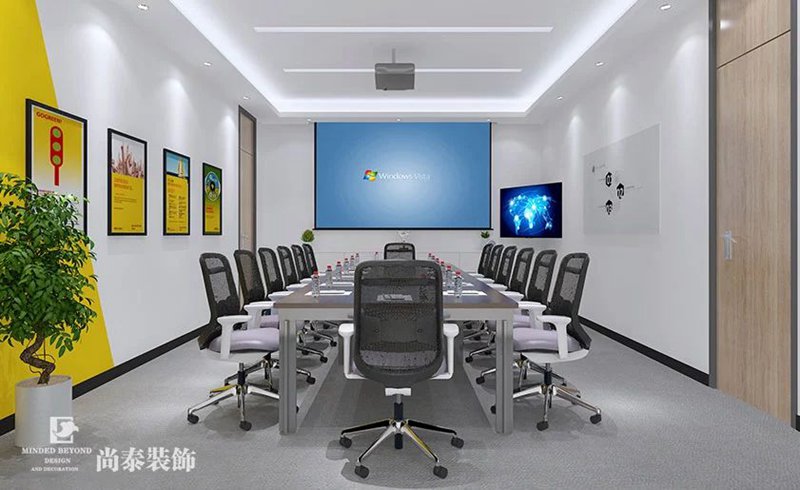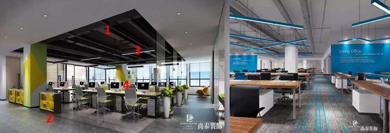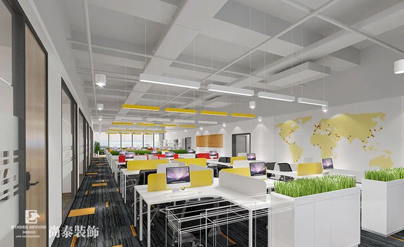 開放辦公區域作為整體員工工作區域,保證員工舒適性,提高工作效率,天花噴灰色漆,天花用黃色和白色的燈裝飾,墻面沒有過多的造型,整體營造的氛圍很和諧。