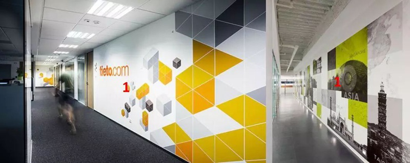 辦公區的過道墻面主要采用顏色的組合形式,豐富整個空間的氛圍,人的視覺也能夠得到緩解。