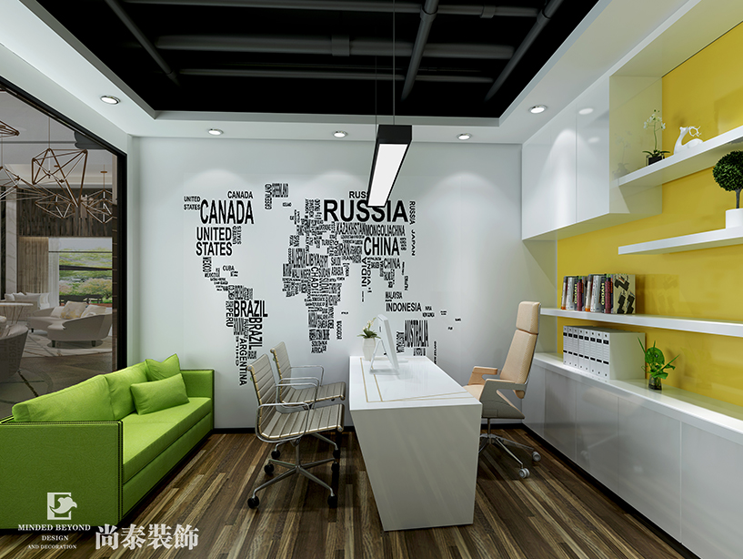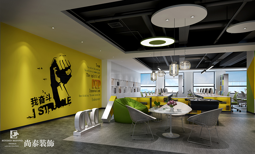同多數(shù)互聯(lián)網(wǎng)公司一樣,千訊工作者主要為年輕人,不僅要求他們能學握專業(yè)知識,同時要求他們具有良好的溝通能力、創(chuàng)新的思維方式。因此,在尚泰裝飾給千訊辦公空間的設計中,我們可以看到一場“理性與感性的相遇”,空間色彩以白、綠、黃為基調,搭配天花板和地板的黑與灰,色塊的合理碰撞將商業(yè)空間與藝術完美結合,打破了以往視覺上枯燥沉悶的工作環(huán)境,力求為員工提供最佳的溝通環(huán)境,最大限度地啟發(fā)他們的創(chuàng)新思維。