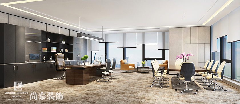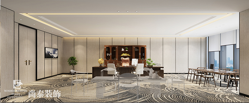 ▲ 董事長辦公室空間造型及材質上更傾向于穩重大氣,簡潔吊頂搭配手工定制的地毯,實木的辦公家私與裝飾木完美結合,打造一個尊貴而大氣的商務空間。