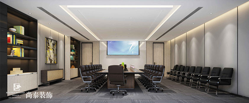 ▲ 會議室墻面以色塊和木飾面相結合,搭配簡單造型的吊頂,讓整個空間視覺上精致而嚴肅。