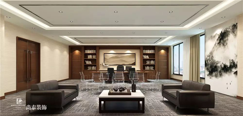 董事長辦公室則采用新中式風格,一幅水墨畫雅致又有韻味,搭配厚重的實木辦公家具等,盡顯穩重氣質。