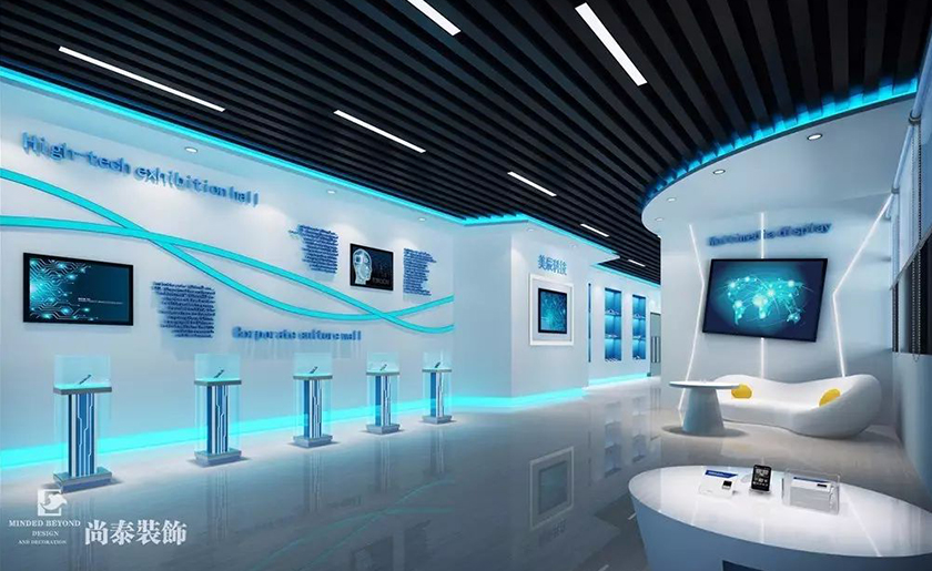 云南美辰科技的展廳同樣讓人過目不忘,時尚靈動的弧形曲線做造型,配合高科技展示媒體設備,讓展廳成為產品亮相的最佳舞臺。