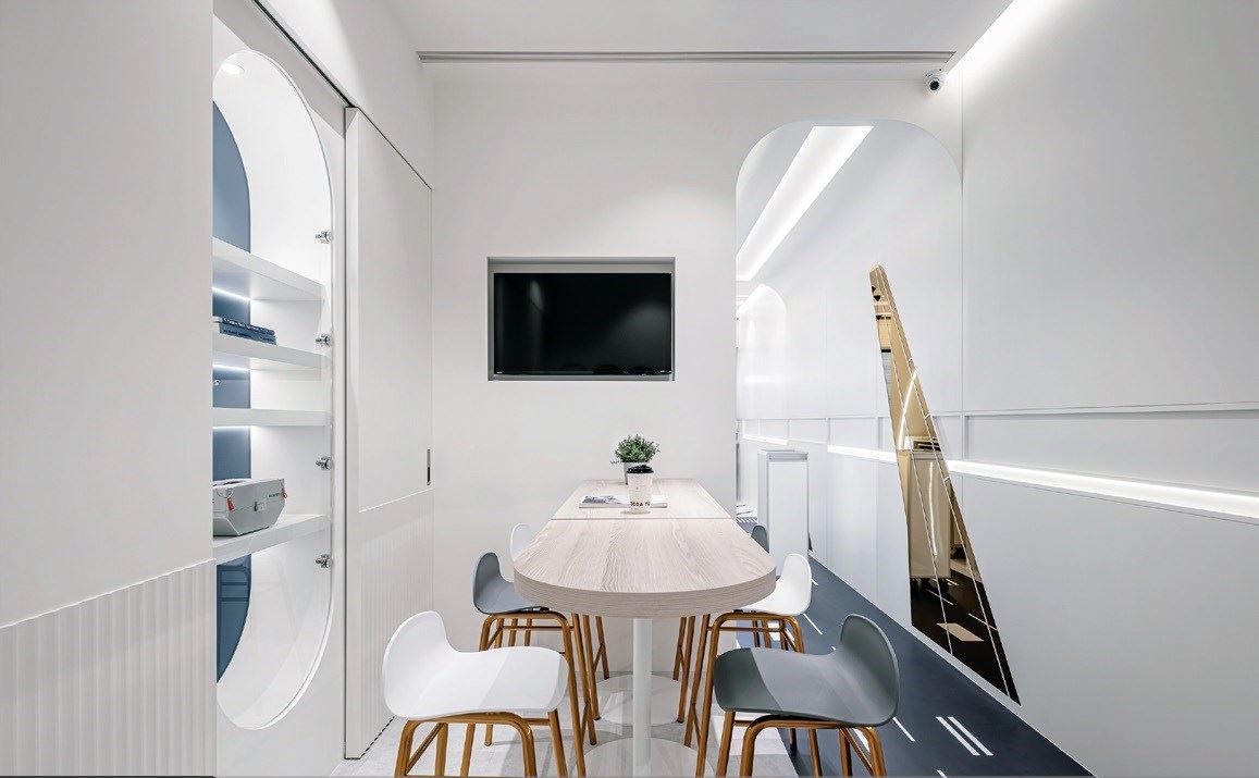 建物外觀透過字母燈招牌聚焦視覺,讓咖啡館猶如一座小型航空站,并可透過玻璃窗望見內部橫向招牌,以航班時刻表造型呈現,完整傳遞飛行主題;走進店內,可見到洗練的白、灰色彩主題,而吧臺采用弧形線條勾勒,呈現帶有金色的水磨石美麗紋理,并選擇止滑、易清潔的機場跑道地貼材質鋪飾走道,更貼近天際的想像;同時,白墻上也置入仿效機艙景觀窗的造型,加上航空餐車的送餐形式,塑造如同飛機實境的趣味氛圍;空間中更特別劃出一獨立空間,完整模擬駕駛艙,實現大眾對于飛行的夢想!