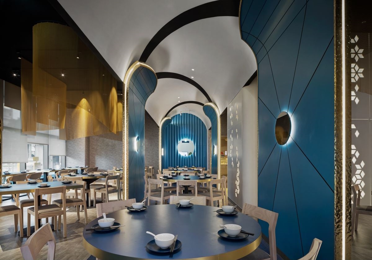 一樓餐飲,規(guī)劃半圓拱門玄關(guān)引導(dǎo)動線,搭配數(shù)位電子螢?zāi)粻I造水瀑意象,形成迎賓的美好風(fēng)景,以藍白色象征水流,讓顧客在室內(nèi)也猶如置身自然美景之中;格局上,則借由挑空天花與大面積落地窗,營造壯闊大器的氛圍,規(guī)劃弧形天花延伸出至頂部開展成獨特造型;空間隔屏采藏青色為基底,加入金屬飾條、隱藏LED燈帶包覆,華貴且低奢,借由錯落配置劃出長條形的類動線廊道,適時為大尺度空間區(qū)分出左右兩個用餐區(qū)塊,與垂墜的金色金屬簾、圓形鏡面、鏤空板的幾何造型光暈,共構(gòu)出具儀式感的視覺主軸!