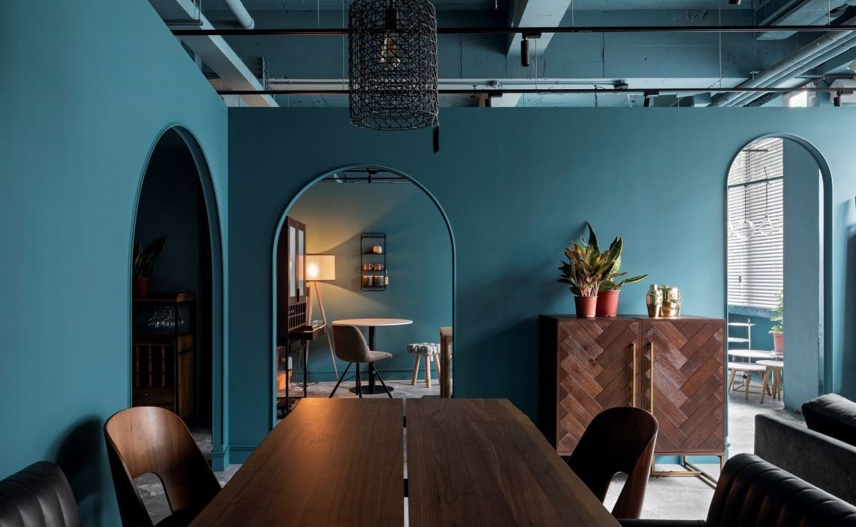 結合選品與家俱的復合式店鋪內,以拱門作為開放式場域間劃分場域的手法,純粹的幾何立面形塑探索空間的過場,自然質樸的水泥粉光鋪陳空間基底,引發來客的好奇心、能自在游走于風格店鋪內。設計團隊運用大量的異材質帶來濃郁的異國情調;土耳其灰藍為主題并用粉色布幔做搭配,金屬材質涵蓋了鐵網、沖孔板以及鐵件,以點線面的方式建構出空間層次。在陳列上除了考慮空間表現外,面對陳列商品的展示架,甘納空間設計也透過人造石與水皮紙管等特色建材塑造商品主題區,兼顧造型同時也打造穩固堅韌的儲藏空間。在剛硬的鐵件材質之下混搭粉紅色布幔襯底,形塑出各類風格選品的伸展臺,也能作為倉庫收納物品、調配空間的彈性,透過空間設計讓顧客感受到選品在日常生活的重要性。