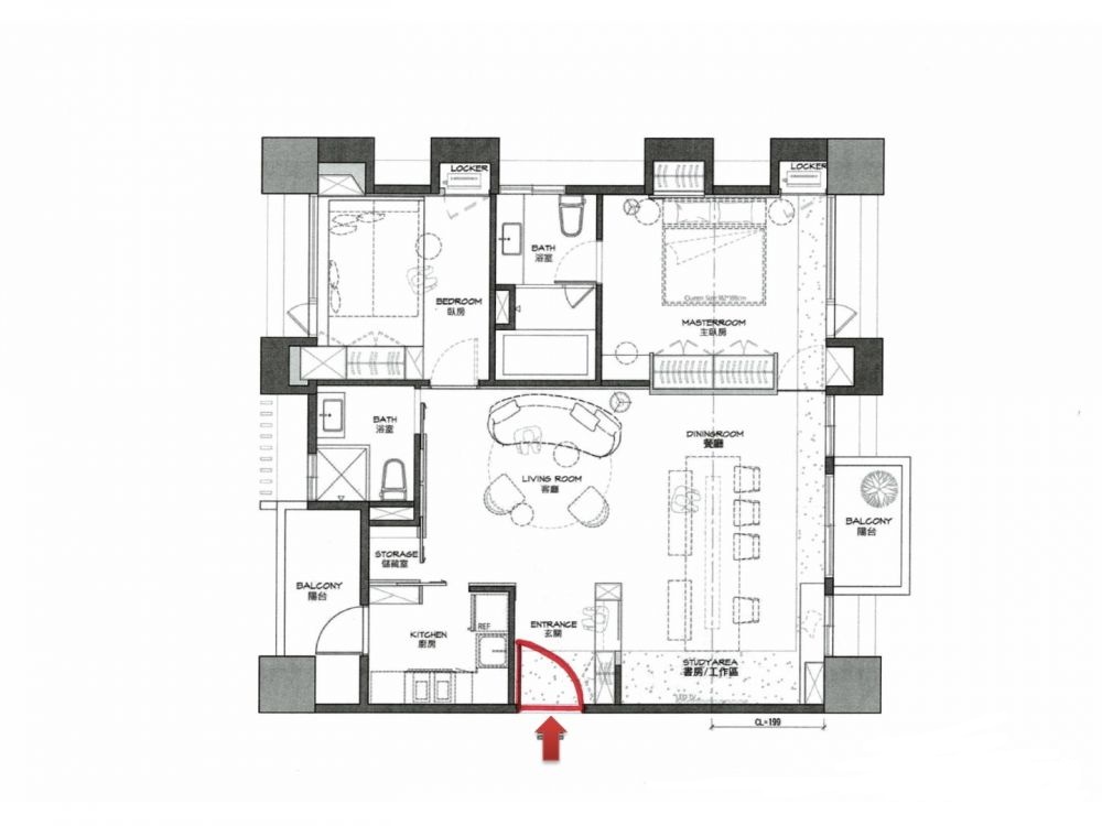 拿到平面設計圖時首先先把大門的方向?qū)首约海箝T方向的圖示為一個1/4圓,有時候還會加上箭頭做辨識。