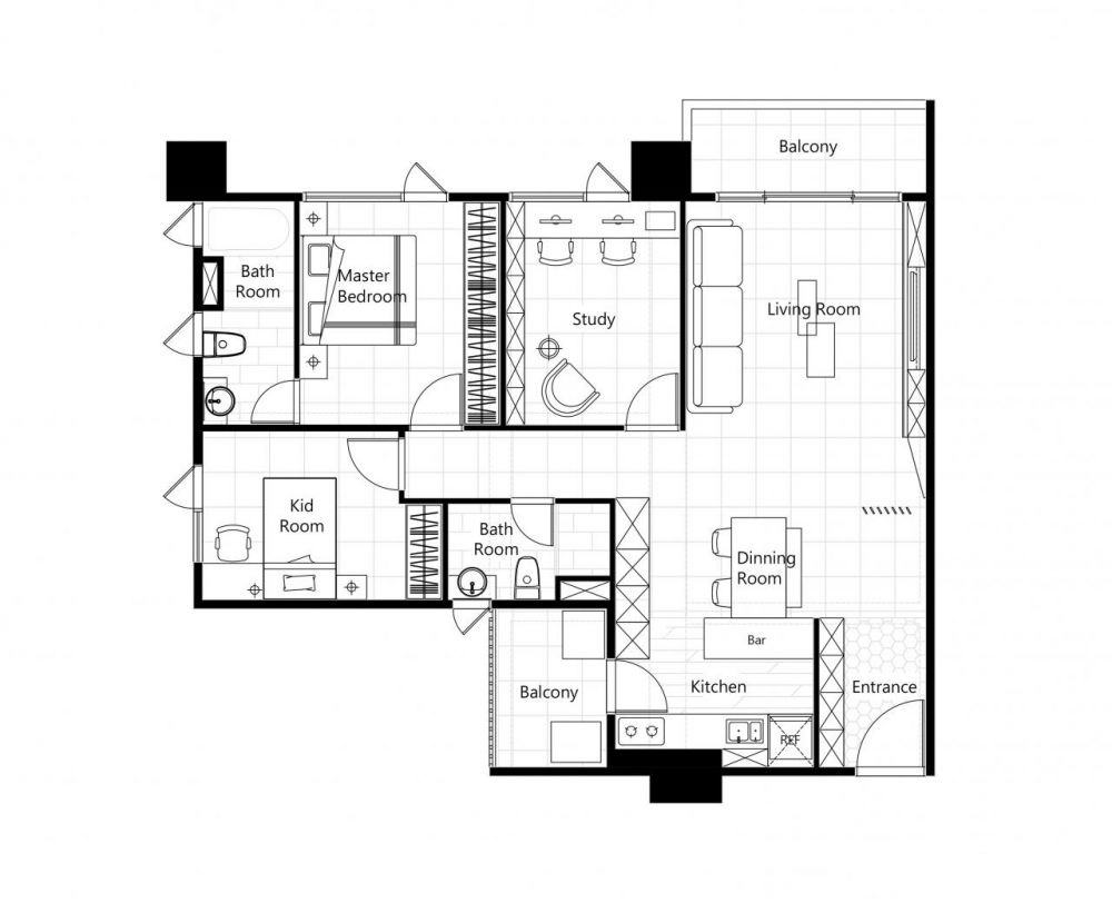 接下來我們從大門開始順著動線來確認格局,一般我們常會說幾房幾廳幾衛(wèi)(幾間房間、幾個廳、幾個衛(wèi)浴)來表示格局,例如下面的平面設計圖就是標準的三房兩廳兩衛(wèi)格局,代表有三間房、客廳、餐廳、兩間衛(wèi)浴,而如果有額外的空間想要講得更清楚也可以另外注明:如更衣室、陽臺等等。