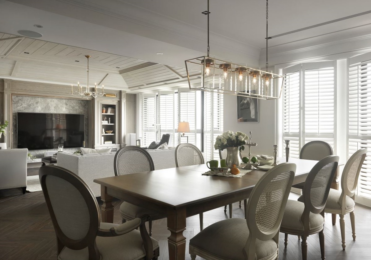 曾經身為三十年前移民加拿大的夫妻,待孩子長大成人后,決定遷徙回老家享受下半場的退休生活,在參觀深圳尚泰裝飾辦公室后,由于欣賞其規劃美式宅邸的美學與功力,在雙方相同的美感共識之下,開啟了這間165平米美式古典大宅的設計起點,快跟著小編一起來看看吧! 入口玄關,透過簍空穿透的屏風促成光線、視線延伸流動,創造出美式庭園的模擬端景,并利用天花板與地坪材質差異,切割出隱形內外場域,交誼廳則呈現木屋式斜屋頂,一體成形銜接了電視墻,讓交誼廳充滿度假宅邸的美好氛圍;色調上,采用美式古典的優雅白作為基底,家具多以淺米、杏色表現出層次感,選用 Ethan Allen 伊莎艾倫經典家具,打造出濃郁的美式風范,搭配坐東朝西方位,以百葉窗將美好光影引導入室。交誼廳、餐桌區則展現美式大宅的好客大方,對最重要的餐廚聚會區,擺放八人大餐桌做為中心,創造賓主盡歡的每一刻! 小編的最愛 主臥則營造出古典酒店的氣度,以寬敞視野讓心感到平靜;次臥房則充滿個人特色,墻面顏色、挑選的家具,都充分展現主人個性,無論是兒子房的清新抹茶綠、或女兒房的柔和淺鵝黃,皆洋溢著輕盈節奏!