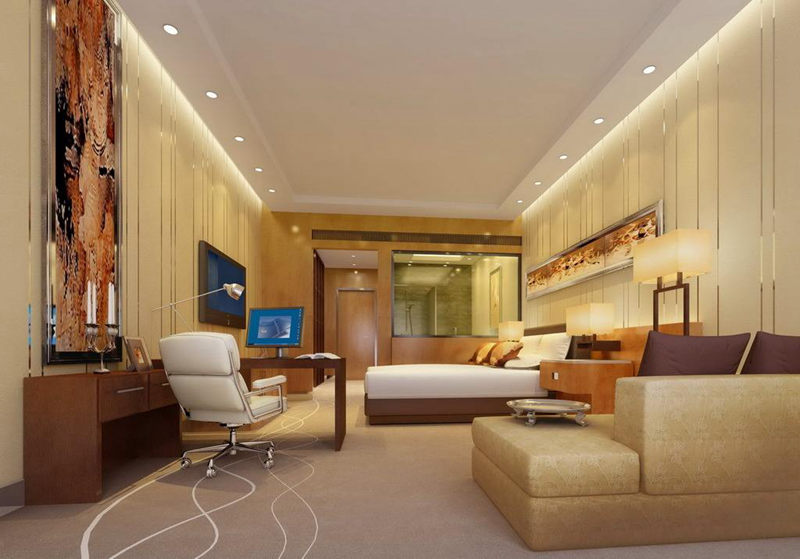 在現(xiàn)代酒店裝修過(guò)程中,我們完全可以讓天花板簡(jiǎn)簡(jiǎn)單單,不再做復(fù)雜的吊頂,減少不必要的消耗。