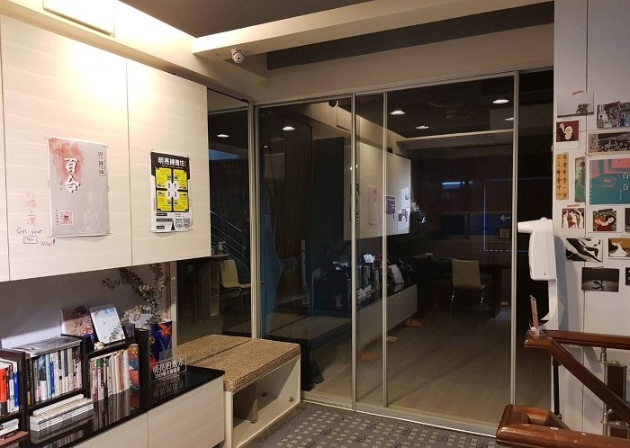 保留街屋建筑體原本的廊道以串聯其他空間,例如儲物、更衣室及衛浴廁所等等,并透過不同地板串接,同時于轉入動線角落擺放一小茶幾,展示藝文空間的活動宣傳,形塑空間意象。