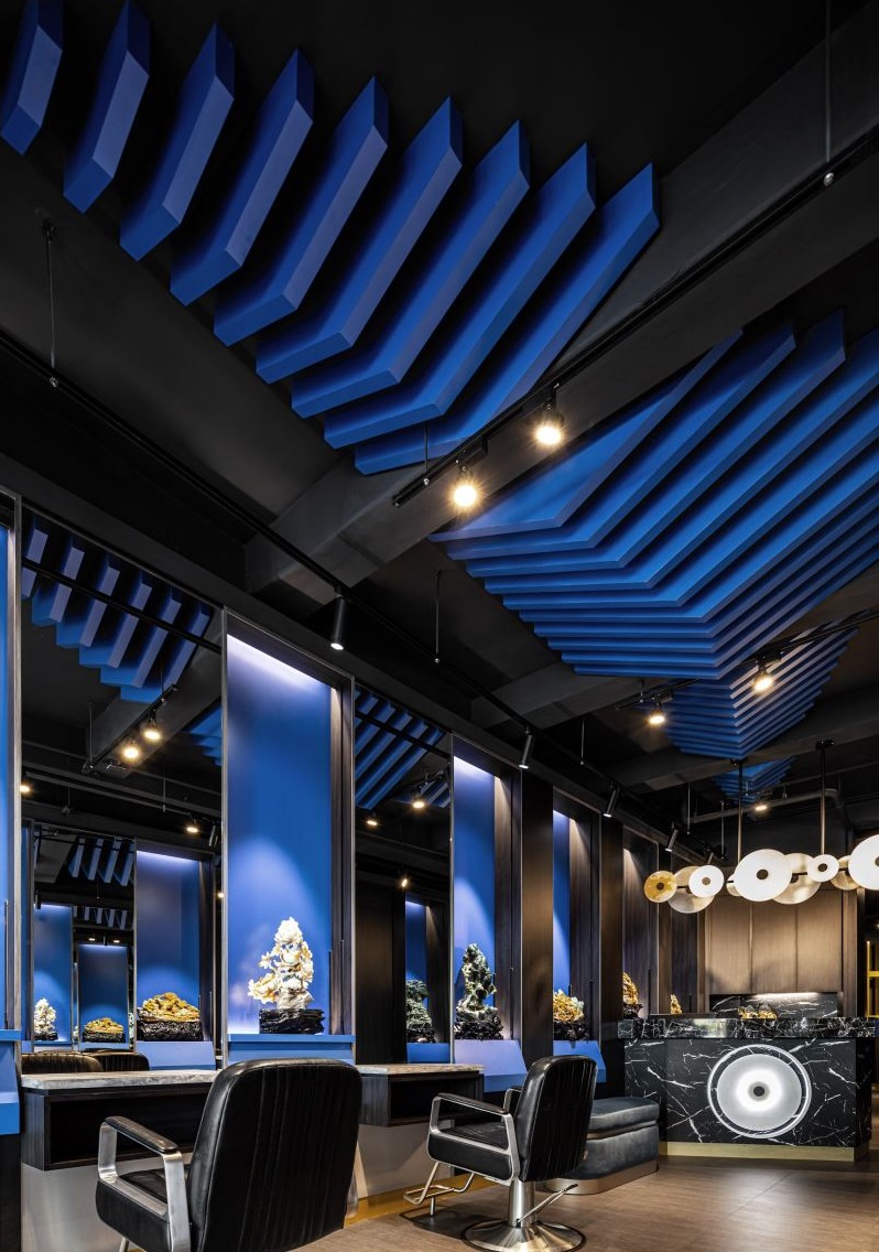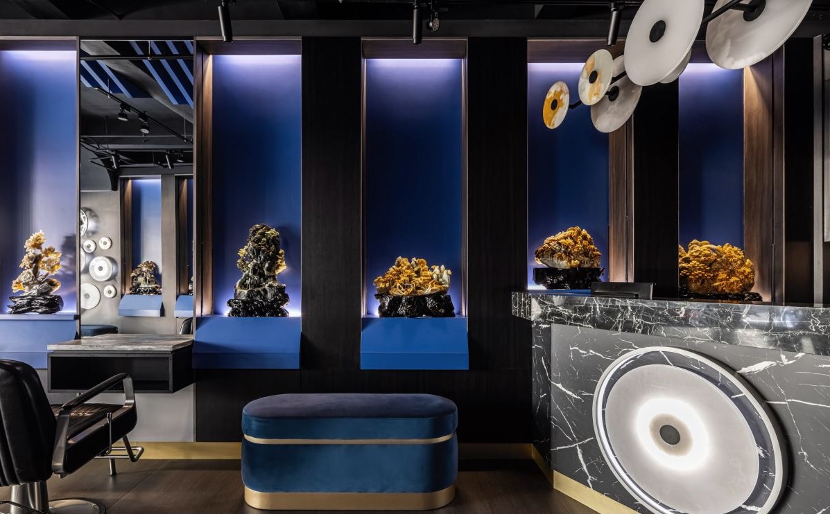 狹長空間中,加入通透的垂直線條,并規劃折線型路徑,在層層穿透之間,讓人體會到溫潤自然石之美及工藝細節,并藉著半透明光澤的細膩玉石妝點,令人猶如置身豐富多元的藝術殿堂,感受玉石的精細巧妙與稀少價值;整體設計將當代空間與工藝融合探索、反思與再演繹,將東方傳統配色正藍、啞黑、金色、酒紅重新植入空間中,以深色木紋質理為基底,天然玉石與木雕藝術為裝飾,借由燈光投射下的對比與透亮突顯出優美與細致;而玉石的略透明之感,采以穿透手法融入于空間區劃上,并運用透明的彩色壓克力材與對稱的鐵件屏風,簡單區隔出走道與美發區,使視覺通透卻又明確分界,透過色彩配置與線條分割提升視覺效果,詮釋人與空間豐富多元的當代之美!